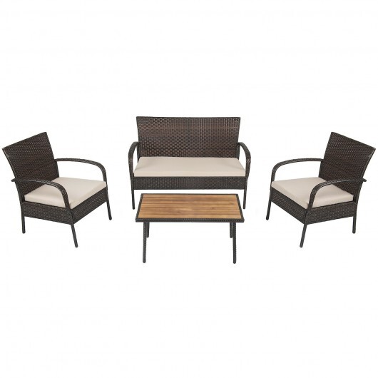 4 Pieces Patio Cushioned Wicker Conversation Set with Acacia Wood Tabletop – Color: Brown
