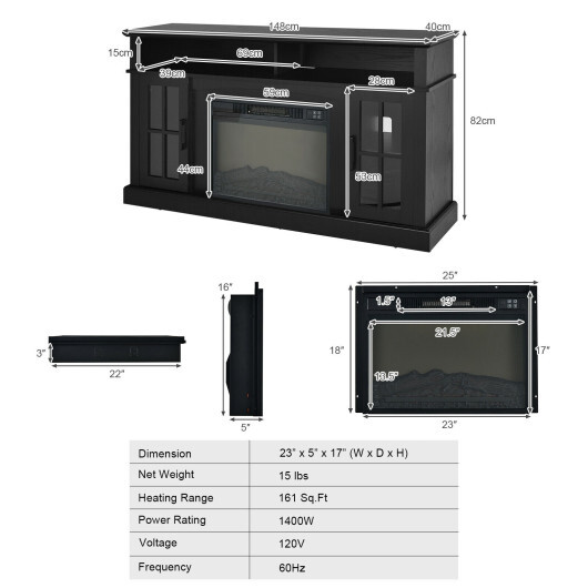 Specifications: Color: Black/Gray/Brown/White Material: Engineered wood + MDF + steel + tempered glass + plastic Overall dimension of TV stand: 58″ x 16″ x 32″ (L x W x H) Overall dimension of electric fireplace: 24.17″x5.10″x17.52″” (W x D x H) Cord length: 6 ft Total net weight: 110 lbs Weight capacity of countertop: 66 lbs Weight capacity of each open shelf: 33 lbs Weight capacity of each upper shelf in the cabinet: 20 lbs Weight capacity of each bottom shelf in the cabinet: 22 lbs Rated power: 1400W Voltage: 120V Frequency: 60Hz Heat output: 5000 BTU Heating range: 400 Sq. Ft Heating sound: <50 dB Adjustable flame brightness: 3-level Adjustable temperature: 62F-82F Timer control: 30 Mins/1 H/2 H/3 H/4 H/5 H/6 H Effective control distance of remote control: 13 ft Package includes: 1 x TV Stand 1 x Electric fireplace 1 x Remote control 1 x Instruction