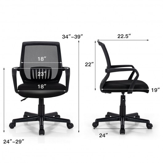 Specifications: Color: Black Material: PP nylon mesh sponge Overall dimension: 24″ x 24″ x (34-39)” (Lx W x H) Adjustable seat height: 16.5″-21″ Armrests height: 24″-29″ Seat size: 18″ x 19″ ( L x W ) Backrest size: 18″ x22″ (W x H) Max load capacity: 300 lbs Net weight: 20 lbs Package includes: 1 x Mesh office chair 1 x User manual